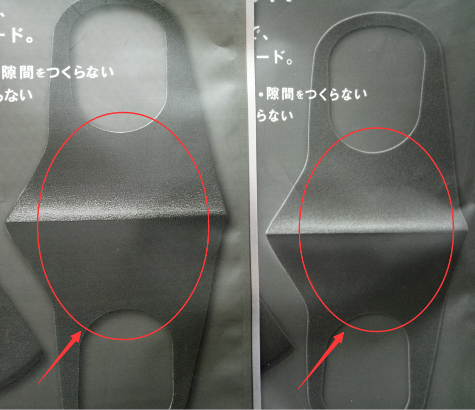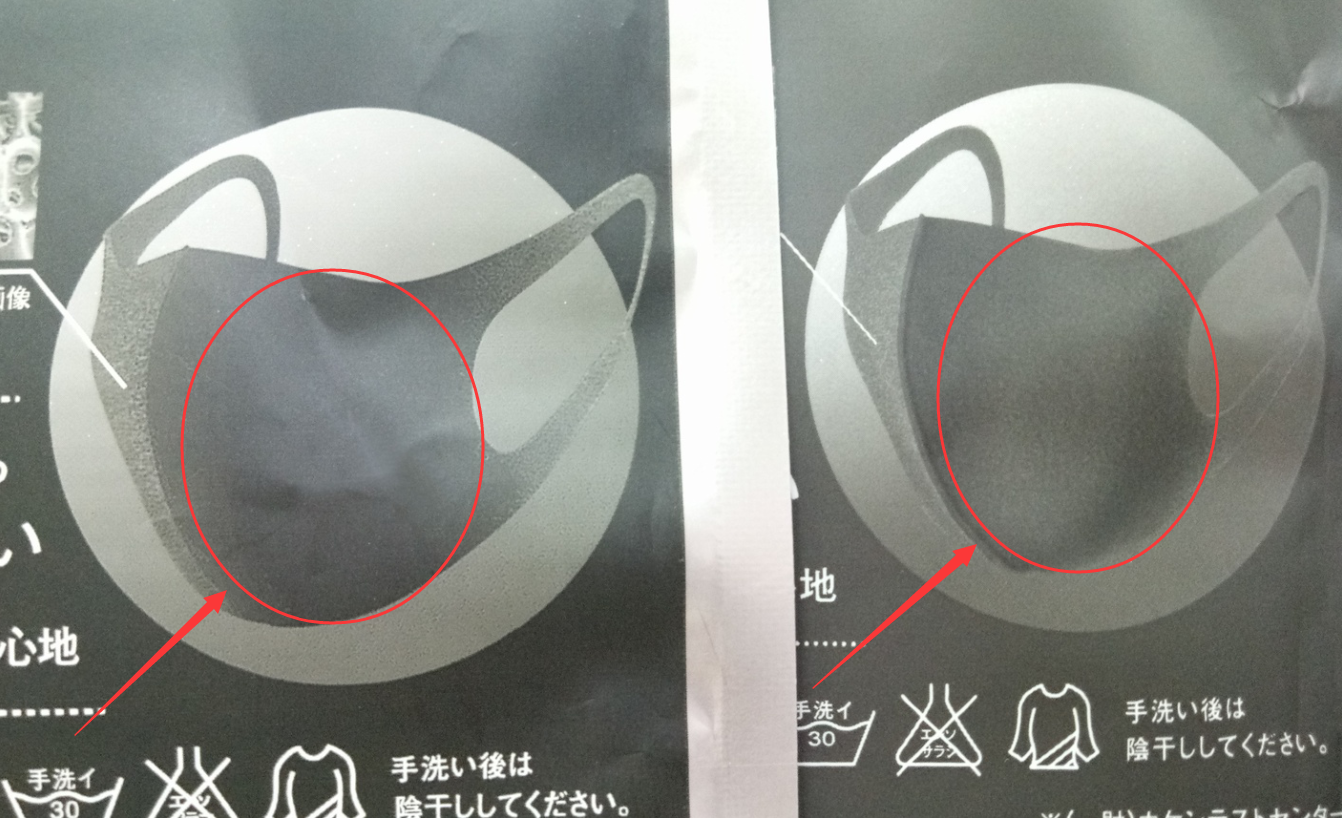 仿品口罩圖案是很粗糙,為了仿造海綿質(zhì)感做出來(lái)的效果反而有一種顆粒感。