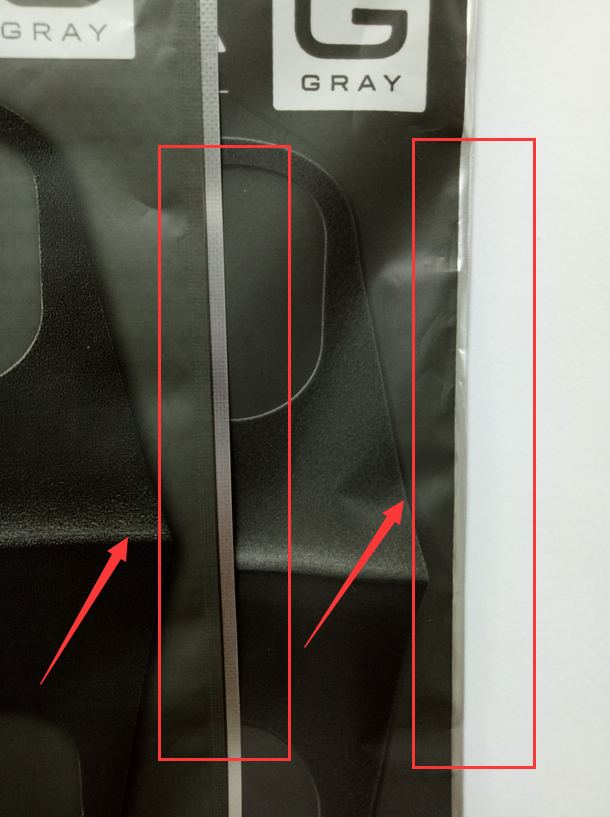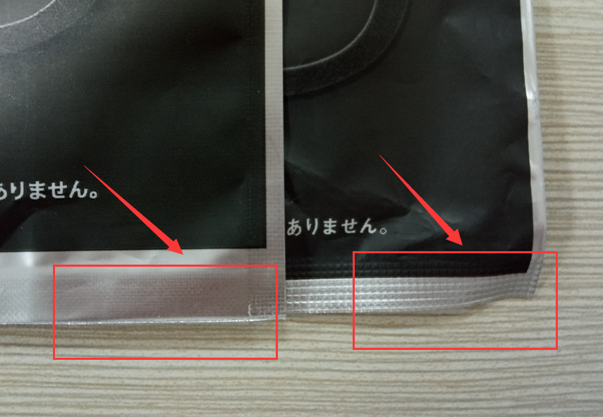 正品:自封口邊緣壓邊面積小幾乎沒有壓邊;包裝袋側(cè)邊封邊采用熱切法,邊緣幾乎無(wú)壓邊。